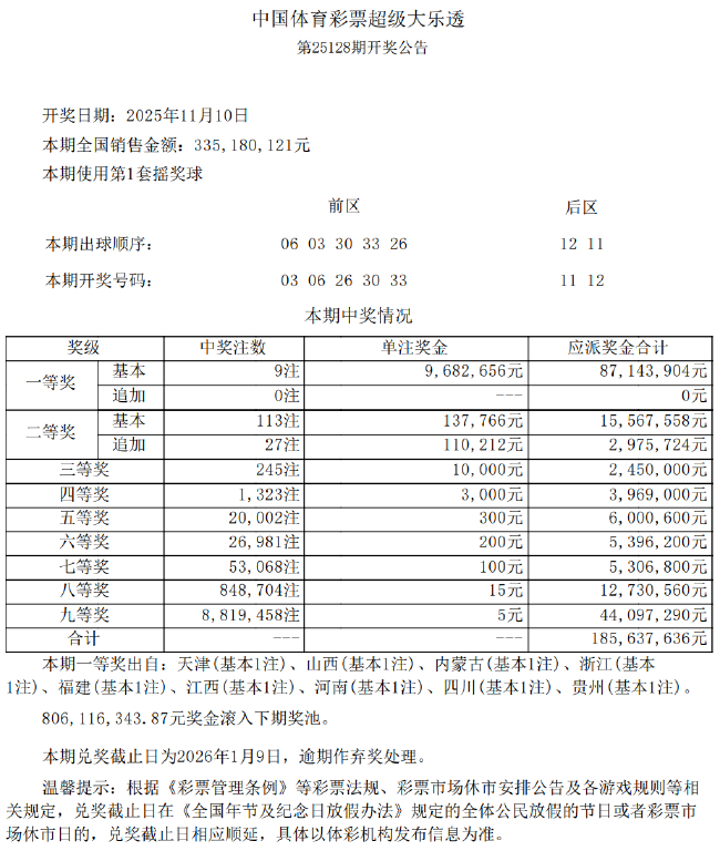 当期开奖号码为:前区03 06 26 30 33,余额亿山西、大乐体彩大乐透第25128期开奖,奖注奖池每注多得奖金11万余元。追加